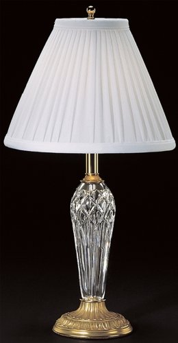 A stylish blending of hand-cut crystal with a brass finish base from renowned crystal maker Waterford. A white rapture shade provides a crowning touch. Uses one 60 watt standard base bulb (not included). Measures 19 1/2" high. Shade measures 4" across the top, 10" across the bottom and 8" high.