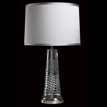 The Waterford Crystal Coil Table Lamp is part of the Waterford Coil Collection. The Waterford Coil Table Lamp features a brushed nickle finish, a spiral cut that winds around the crystal and a silver silk dupioni shade. This Waterford table lamp is 30.5" tall, has a three-way socket for a 100 watt max bulb and the shade measures 16" x 17" x 12" . Please call us if you have any questions about any Waterford lamps or if you would like to order a Crystal Coil Table Lamp by phone.