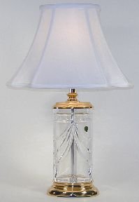 This crystal table lamp features the elegant Overture™ pattern that is exclusive to Waterford. Brass base and accents adds extra shine to the design. The top shade is a flared bell in a white fabric with fold-over self trim. 3-way socket provides easy lighting control. Takes one 100 watt bulb (not included). 28" high. Shade is 6" across the top, 8" across the bottom and 15" high.